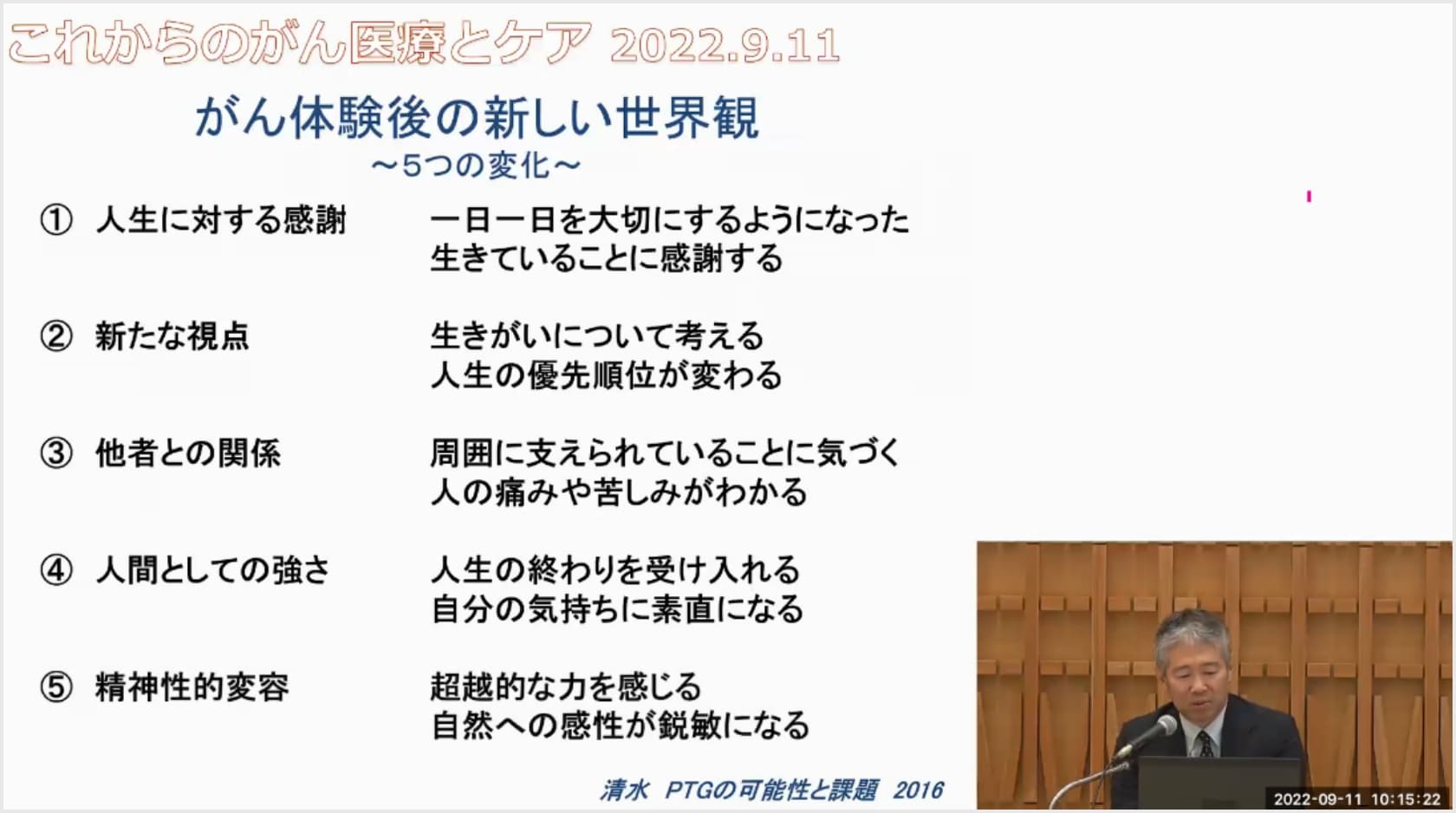 まず、がん患者さんと家族の心のケアは、診断前から治療のすべての時期いつでも必要であること。病気を前にして為す術が無く立ちすくむだけでなく、「自身でできることがある、自身をコントロールできる」という感覚をもう一度見出していただくことが、心のケアの到達点ではないか、と考えを示されました。
